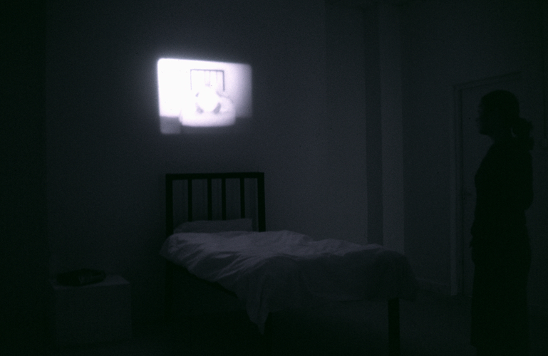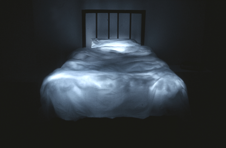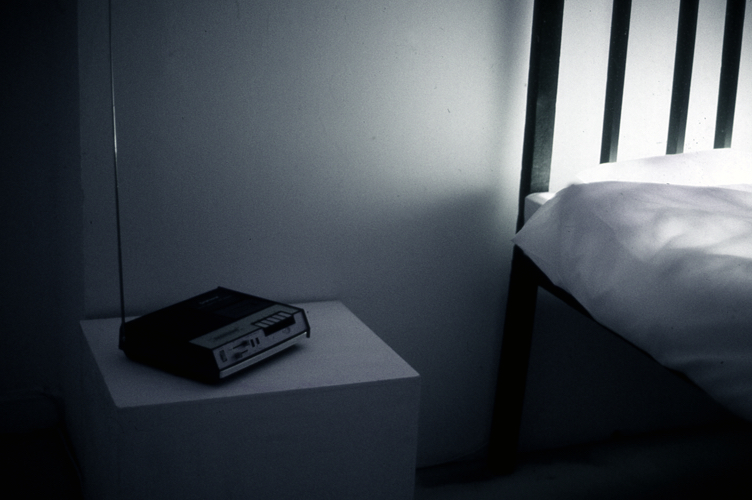 This piece features a softly glowing bed in a white room with an image of film burning projected on the wall. The film eventually burns completely, leaving the only the white rectangle of light from the screen on the wall. After some time, a man sleeping in the bed displayed in the installation appears in this white space. He wakes up and gets out of the bed, and then moves in front of the camera, which then goes black. The 16mm film projector turns off concurrent with this due to an automatic switch, and the bed fills with light. An actual radio program can then be heard coming from the radio set up next to the bed.This film installation is meant to deal with the experiencing of “dreams” as a sort of borderland between the real and the unreal